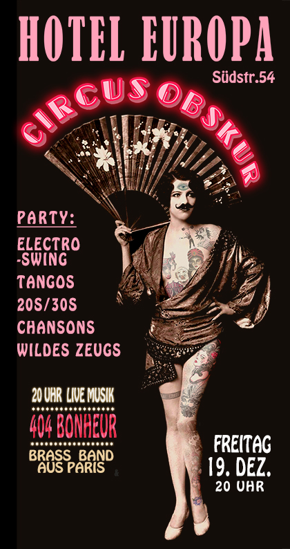 nach langer, langer Pause ist der „Circus Obskur“ zurück im Hotel Europa ! „Der Herr Direktor“ aka Udo aka Boss vom Hotel | „DJ DerMaik“ (Funky Porn / Kaschémme Bohéme) | „Brikic“ (Pink Lenin / Kaschémme Bohéme / Grundrauschen ) | „Runkelratz“ (wundervoll)